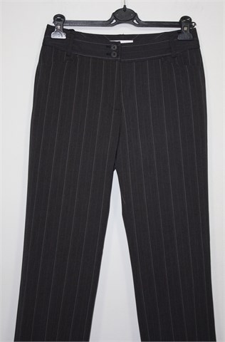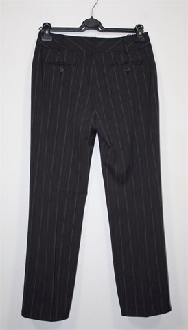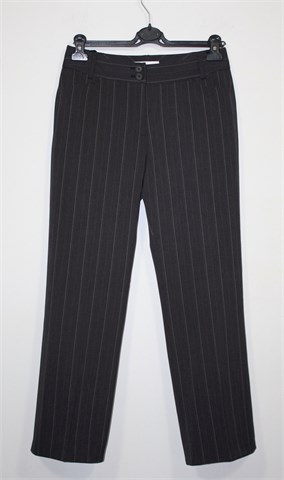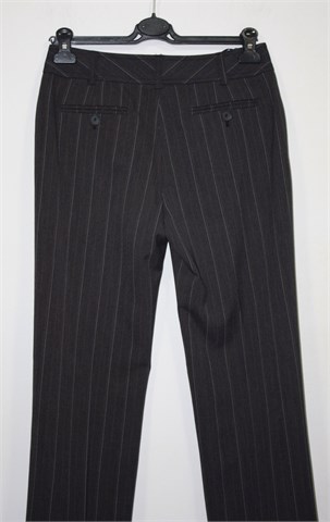 Biaggini hlače tamno sive boje sa prugama (bijelim i svijetlo smeđim). Prednji cif i kopčanje, pasica za remen. Prednji bočni, stražnji skriveni džepovi sa gumbom. Materijal je kao mekani štof, blago rastezljiv. Skraćene (profesionalno).