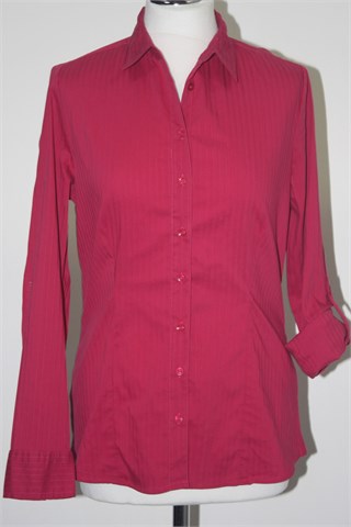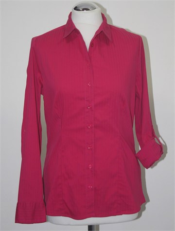 Biaggini košulja sa dugim rukavima, boje ciklame sa diskrentim prugama (na slici je ispala roza ali uživo je lijepa boja ciklame). Prednje klasično kopčanje, prednji i stražnji ušitci (blago strukirana). Rukavi se mogu nositi i kao poludugi (vanjski gumbić i unutarnja vezica u rukavu). Lagan i rastezljiv materijal.