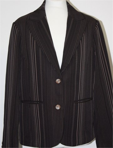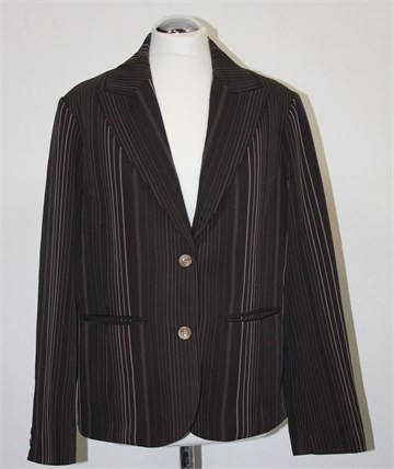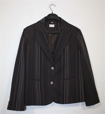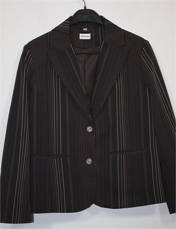 Biaggini sako klasičnog kroja, tamno smeđe boje sa svijetlim prugama. Prednje kopčanje, bočni džepovi, gumbići na krajevima rukava. Blagi jastučići u ramenima, podstavljen.
