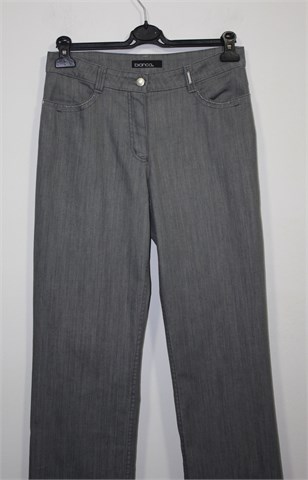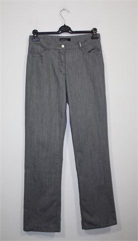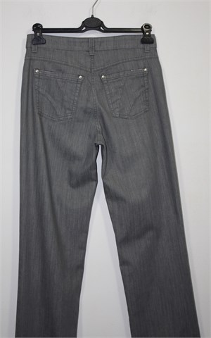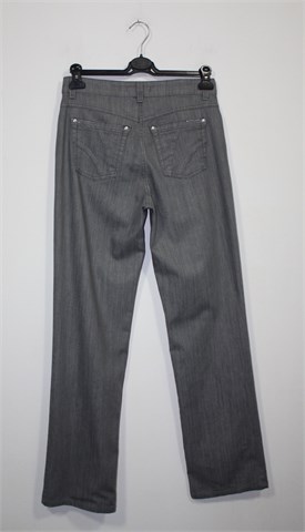 Bianca traper hlače sive boje, ukrašene prošivima od srebrnog konca. Prednji cif i kopčanje, pasica za remen. Prednji i stražnji klasični džepovi. Blago rastezljive.