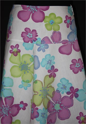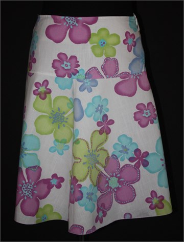 Bianco Ballo suknja bijele boje sa šarenim cvjetnim printom. Bočni cif, bočne ušice za remen. Podstavljena.