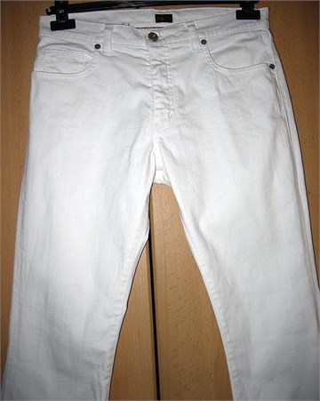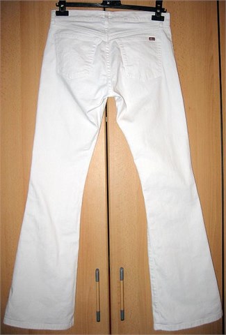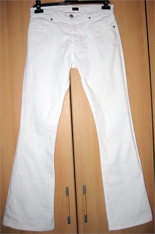Hlače od trapera bijele boje (keper). Prednji i stražnji klasični džepovi, pasica za remen, prednji cif i kopčanje. Na hlačama piše veličina 29, dužina nogavica 30, mislim da najbolje odgovaraju veličinama 36/38. Malo rastezljive.