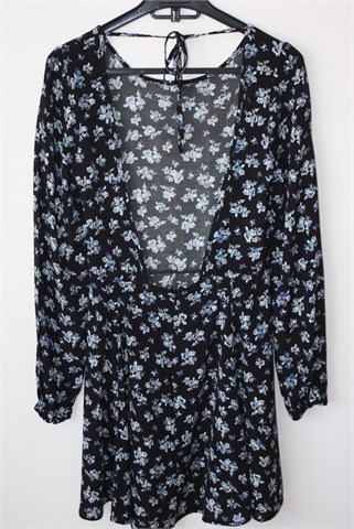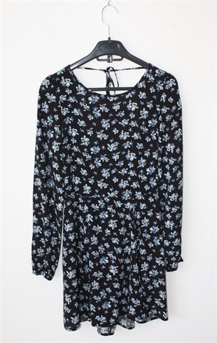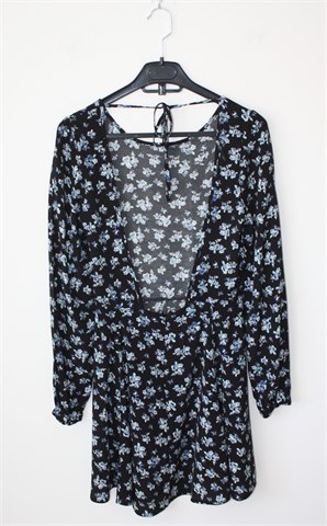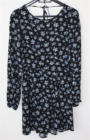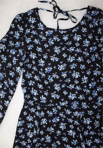 Bik Bok haljina/tunika sa dugim rukavima, crne boje sa cvjetnim printom (boje i uzorak printa vidljivi na slikama). Rukav na dnu stegnut gumicom, na vratu vezice, stražnji cif (na leđima otvor - vidljivo na slikama). Lagan materijal, vrlo blago rastezljiv.