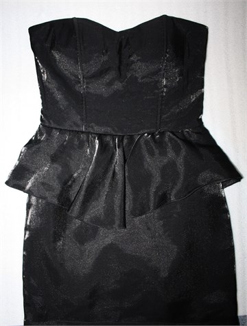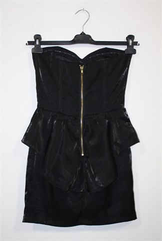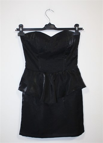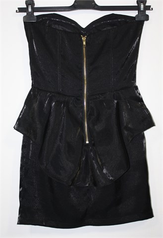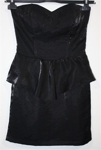 Bik Bok haljina bez naramenica, crne boje sa sjajnim nitima u materijalu. U struku volančić, sa stražnje strane cif. U gornjem dijelu pojačana plastičnim žicama, ušiveni jastučići/pojačanje za grudi (ne mora se nositi grudnjak). Uz gornji šav haljine našivena je silikonska traka (drži haljinu na mjestu). Cijela podstavljena.