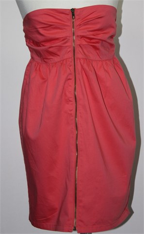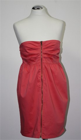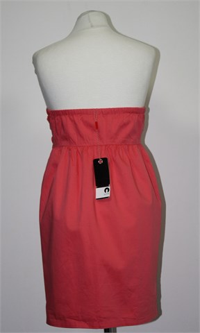 Bik Bok haljina bez rukava, svijetlo koraljne boje (nešto između roze i narančaste boje). Prednji cif, podstavljena. Na leđima gumica pa je širina prilagodljiva.