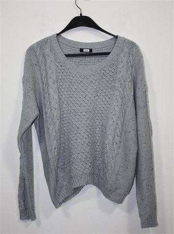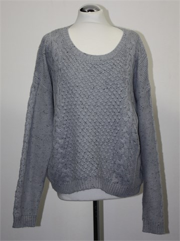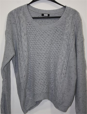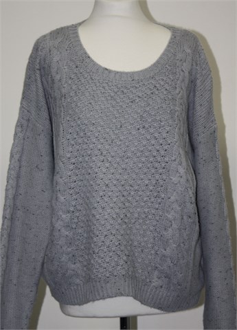 Bik Bok vesta/pulover sivo-plave boje sa mjestimičnim uzorkom na pletivu. Mekana i rastezljiva. Širi i kraći model.