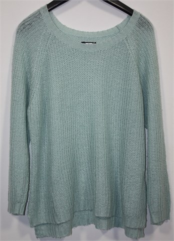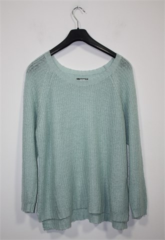 Bik Bok vesta sa dugim rukavima, svijetla nijansa mint plavo-zelene boje. Tanje i rupičasto pletivo, vrlo rastezljivo. Oversized model, malo duža sa stražnje strane.