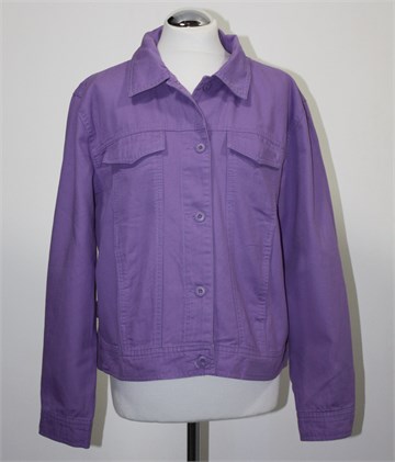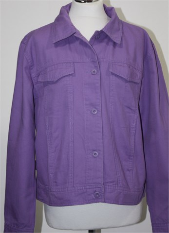 Billblass jeans jakna ljubičasto-lila boje, materijal je kao laganiji traper. Prednje kopčanje, džepovi na prsima, bočni džepovi. Na krajevima rukava po jedan gumb.