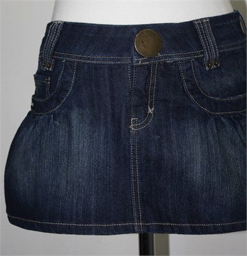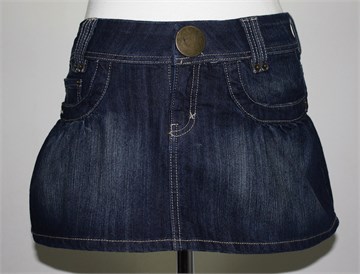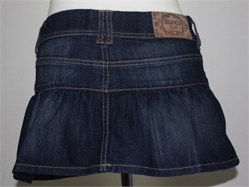 Blanco Jeans kratka traper suknja, tamnije plave boje, mjestimično ispranog izgleda. Prednji cif i kopčanje, pasica za remen. Prednji bočni džepovi, vrlo blago rastezljiva.