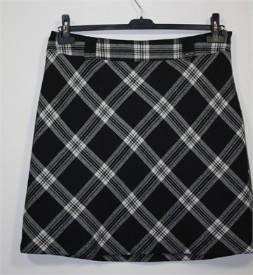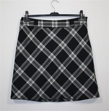 Blue Motion zimska suknja crno-bijele boje s uzorkom. Bočni cif, uska pasica za remen. Podstavljena, blago rastezljiva. Materijal je kao mekani štof. Malo je duža sa stražnje strane (vidjeti mjere).