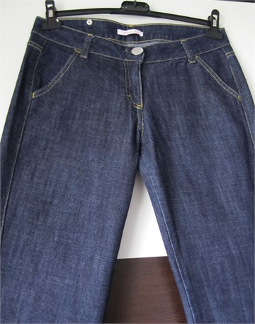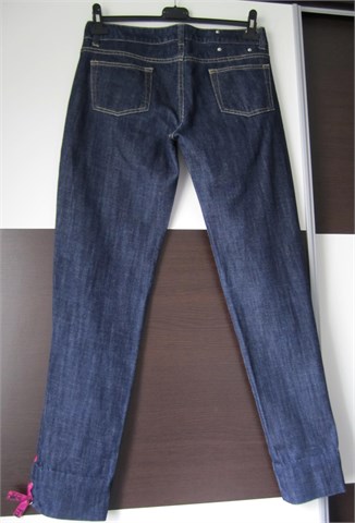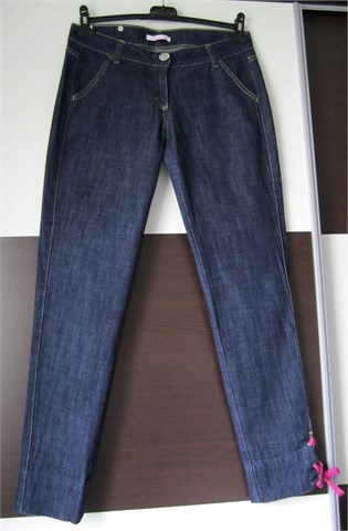 Prekrasne dizajnerske talijanske hlače marke Blugirl Folies od tamnijeg trapera, skinny kroja. Hlače imaju prednji cif i kopčanje, pasicu za remen. Prednji i stražnji klasični džepovi. Na dnu lijeve nogavice je uvezena špagica sa logom, ciklama roze boje. Predivan i jako kvalitetan traper.