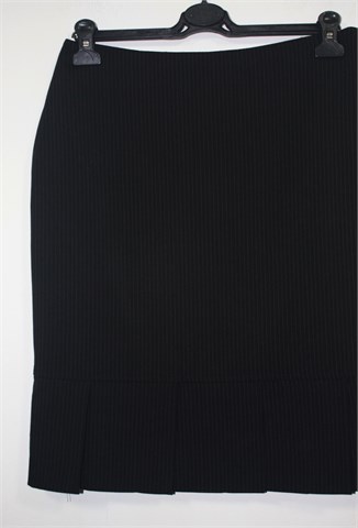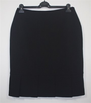 Blunauta suknja crne boje sa tankim isprekidanim bijelim prugama. Stražnji cif, podstavljena (podstava je bočno uz šav rastegnuta ali ne smeta kod nošenja). Na dnu suknje (sa obje strane) faldice, između faldica prorezi. Lagan i tanji štofasti materijal.