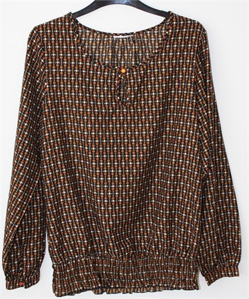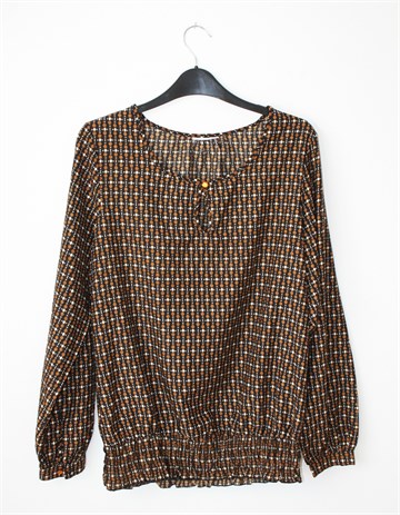 Bluza sa dugim rukavima, crne boje sa smeđe-bijelim printom (uzorak printa vidljiv na slikama). Gumbić na kraju svakog rukava, prošivena gumicama u pasici. Tanja i lagana, nije rastezljiva.