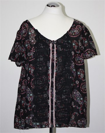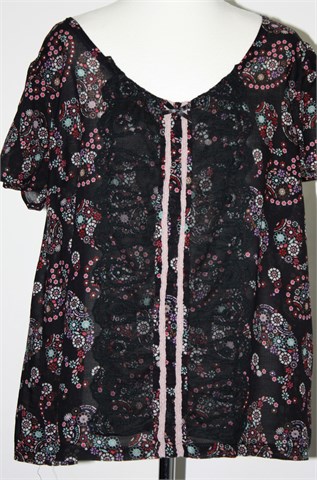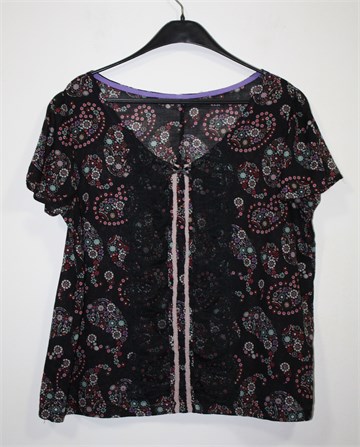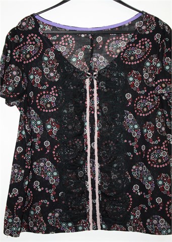 Šivana i unikatna bluza sa kratkim rukavima, crne boje sa printom i ukrasnom čipkicom (vidljivo na slikama). Kratki rukavi, materijal je tanji i lagan (blago providan), nije rastezljiv.