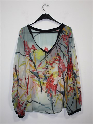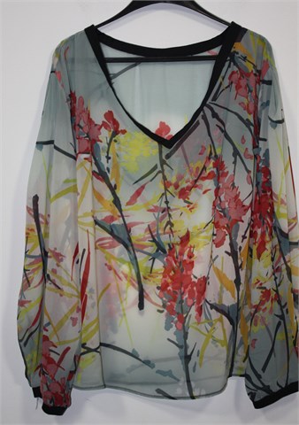 Šivana i unikatna bluza sa dugim rukavima. Šareni uzorak (boje kao na slici), obrub rukava i ovratnik crne boje. Lagana i prozračna, providan materijal.