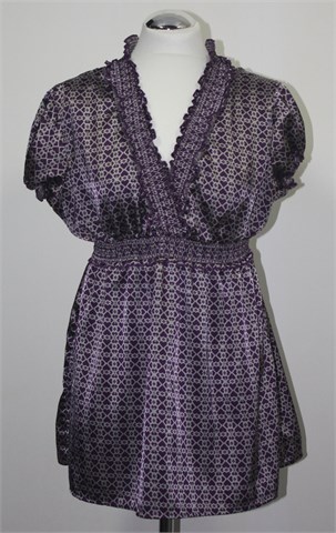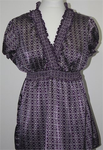 Bluza od sjajnog i glatkog materijala (djeluje kao saten) sive boje sa printom u ljubičastoj boji. Kratki rukavi, stegnuta gumicama ispod prsiju, na rukavima i oko dekoltea. Vrlo lagan materijal, blago rastezljiv.