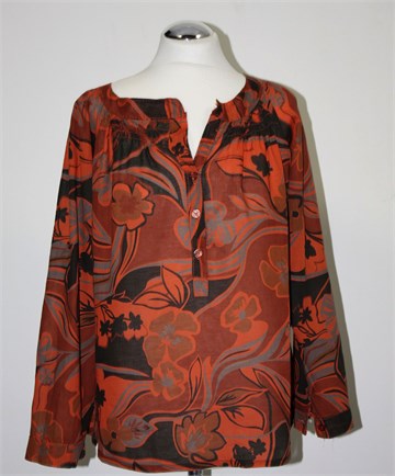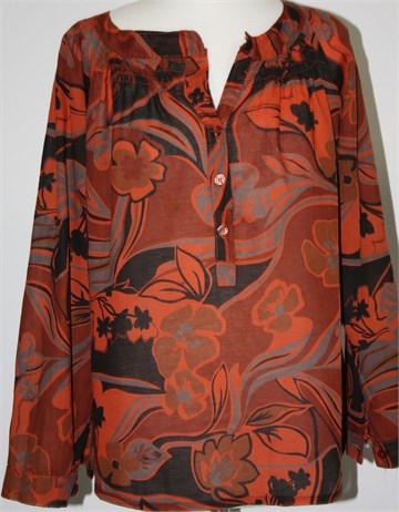 Bluza sa dugim rukavima (mogu se nositi i kao kraći - unutarnja vezica i vanjskih gumbić na rukavu), smeđe-narančaste boje sa printom (boje i uzorci kao na slici). Prednji gumbići, bočne ušice za remen (bez remena). Lagana i prozračna.