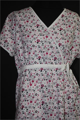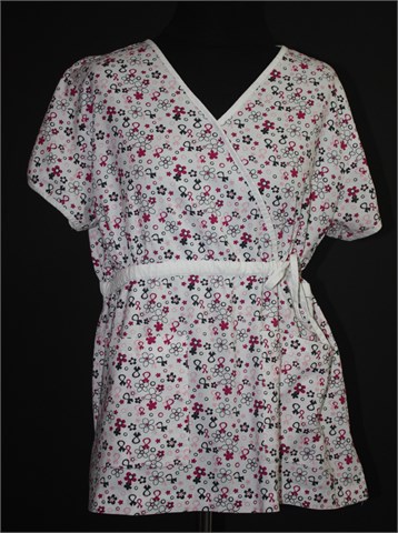 RX Gear bluza za medicinsko osoblje sa kratkim rukavima, bijele boje sa printom ) na slici. Sa prednje strane fiksni preklop, ispod grudi je vizualno rezana trakom u kojoj je špagica za vezanje. Dva prednja džepića, mali bočni prorezi. Čvrsto platno.