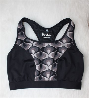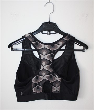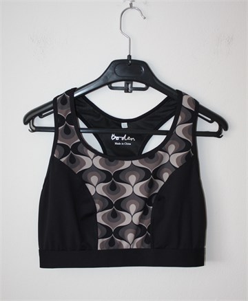 Boden sportski topić crne boje, dio topića ima uzorak (boje uzorka vidljive na slikama). Stražnje kopčanje, mrežasto podstavljen. Rastezljiv.