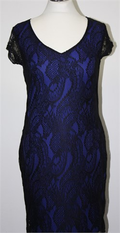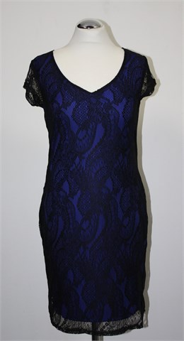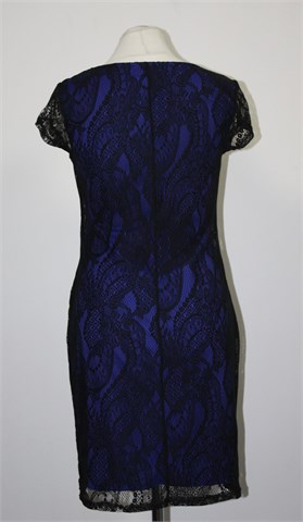 BodyFlirt haljina sa kratkim rukavima, vanjski sloj je crne boje (rastezljivi til sa uzorkom čipke), unutarnji sloj (podstava) je kraljevsko plave boje. Rastezljiva, lijepo se prilagođava tijelu.