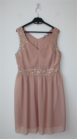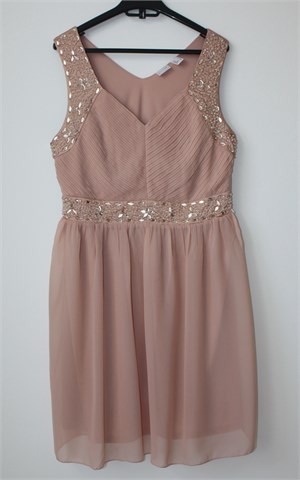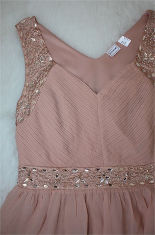 BodyFlirt haljina bez rukava, tamnije nude boje. Sa prednje strane plisirana (dio iznad prsiju), obrub rukava i struk sa našivenim aplikacijama (vidljivo na slikama, par ih se malo odšilo). Bočni cif, podstavljena. Stražnja strana pasice struka je prošivena sa gumicama (rastezljivo - vidjeti mjere).