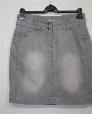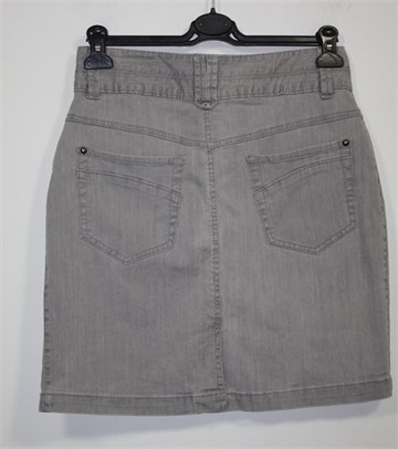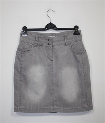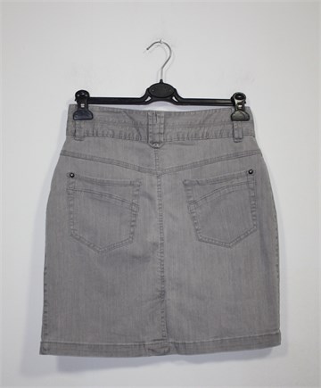 Bon'a Parte traper suknja sive boje, mjestimično ispranog izgleda (tvornički). Prednji cif i kopčanje, pasica za remen. Prednji bočni, stražnji klasični džepovi. Malo duža sa stražnje strane (vidjeti mjere). Mali stražnji rasporak, rastezljiva.