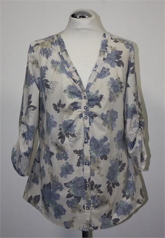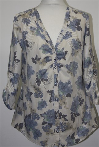Bonita košulja sa poludugim rukavima, bijele boje sa bež prugama i plavo-zeleno-bež cvjetnim printom. Prednje kopčanje, gumice na krajevima rukava (blago su nabrani). Tanja i lagana, nije rastezljiva.
