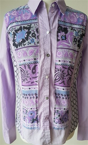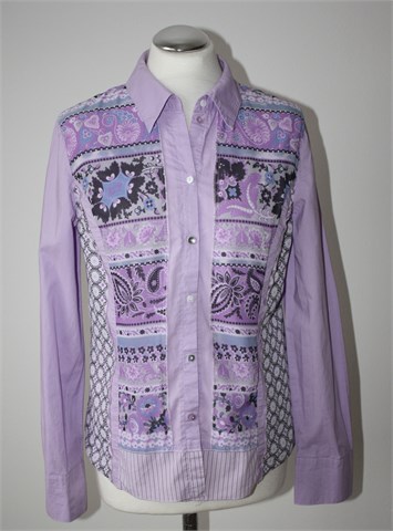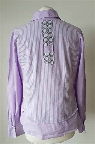 Bonita košulja sa dugim rukavima, svijetlo ljubičasto-lila boje. Sa prednje strane našiven šareni materijal, sa stražnje strane našiven je prugasti materijal (vidljivo na slikama). Prednje kopčanje, blago strukirana. Vrlo blago rastezljiva.