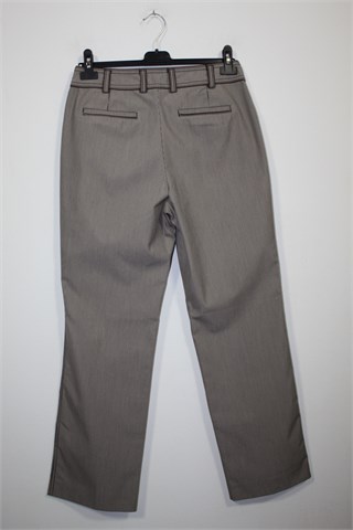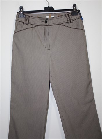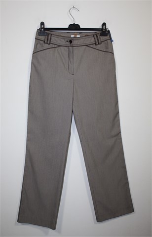Bonita prugaste hlače (kombinacija bijele, sivo-smeđe i crne boje). Prednji cif i kopčanje, Prednji bočni, stražnji ukrasni/lažni džepovi. Šire nogavice, vrlo blago rastezljive.