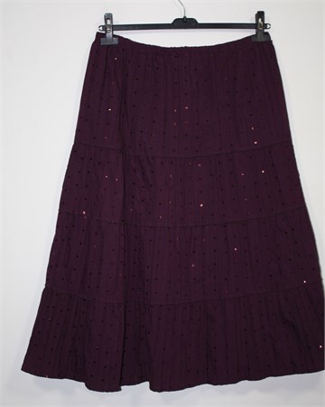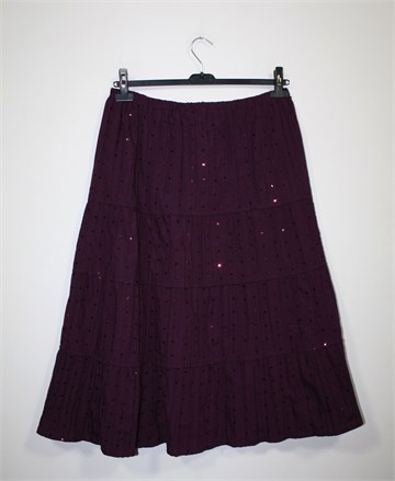 Bonmarche duža suknja tamno bordo-ljubičaste boje, ukrašena ukrasnim proštepima i našivenim šljokicama. Lagan, tanji i prozračan materijal. Gumica u struku pa je širina prilagodljiva (vidjeti mjere).