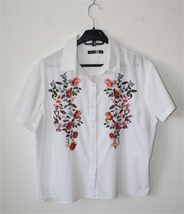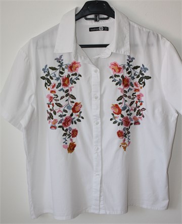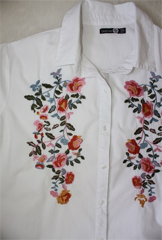 Boohoo košulja sa kratkim rukavima, bijele boje sa prednjim aplikacijama od konca (vidljivo na slikama). Prednje kopčanje, nije rastezljiva.