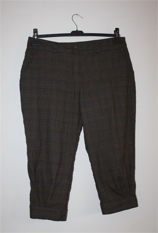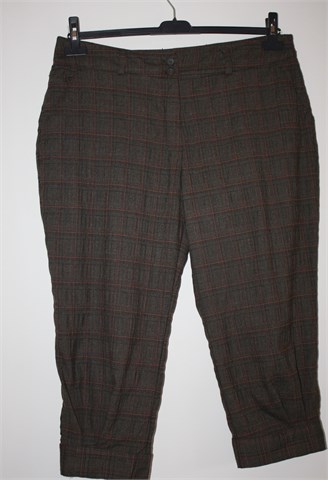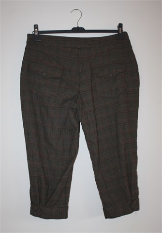Boule poluduge hlače smeđe boje s uzorkom (kao na slici). Prednji cif i kopčanje, pasica za remen. Prednji bočni, stražnji džepovi sa preklopom i gumbom. Tanji i mekan materijal, blago rastezljiv.