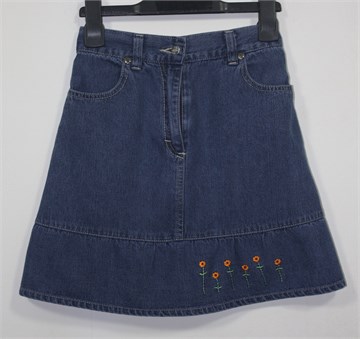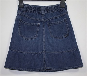 Boys & Girls suknja od trapera, srednje plave boje. Prednji cif i gumb, pasica za remen. Prednji i stražnji džepovi, aplikacije od konca. Stražnja strana pasice je rastezljiva.