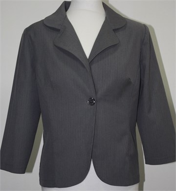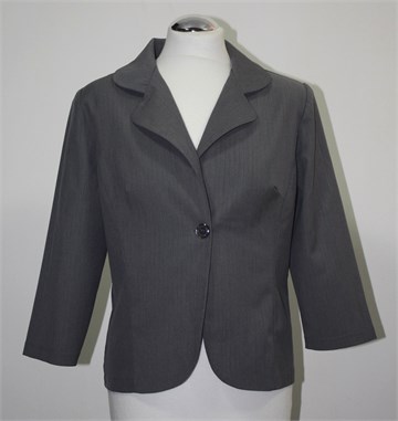 Breakin' loose sako/blazer sa poludugim rukavima, sive boje sa diskretnim tamnijim prugama. Prednje kopčanje sa jednim gumbom, jastučići u ramenima (mogu se lako odšiti). Djelomično podstavljen (samo stražnji gornji dio, i podstava se malo odšila po donjem rubu, par cm). Prednji i stražnji ušitci, blago strukiran. Tanji materijal, blago rastezljiv.