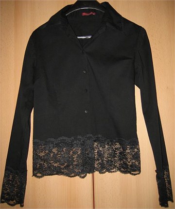 Dugi rukavi, ukrasna čipka na rukavima i na dnu košulje, strukirana, ušitci. Prednje kopčanje, na kragni ušivena ukrasna trakica od čipke. Rastezljiva. Par puta nošena.