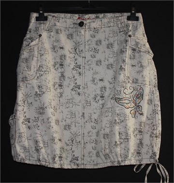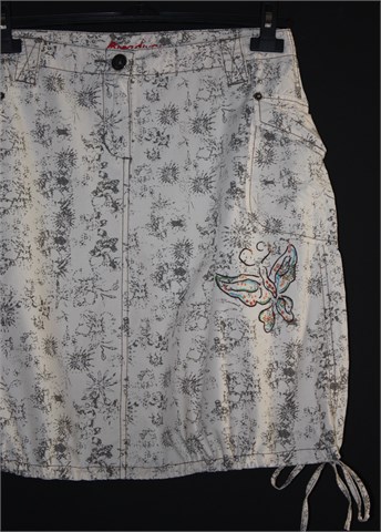 Broadway pamučna suknja nude-bež boje sa sivim printom. Prednji cif i kopčanje, pasica za remen. Bočni džepovi sa preklopom, prednja ukrasna aplikacija od konca i cirkona. Na dnu pasice je uvedena špagica koja se po želji može zategnuti.