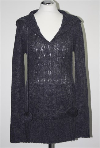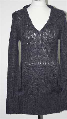 Broadway duži pulover/vesta sa kapuljačom, prošarano ljubičasto plavo-sive boje. Sa prednje strane klokan džep (ukrašen pletivom sa uzorkom pletenica), dvije vezice sa coflekima-lopticama. Mekano, blago rupičasto i rastezljivo pletivo.