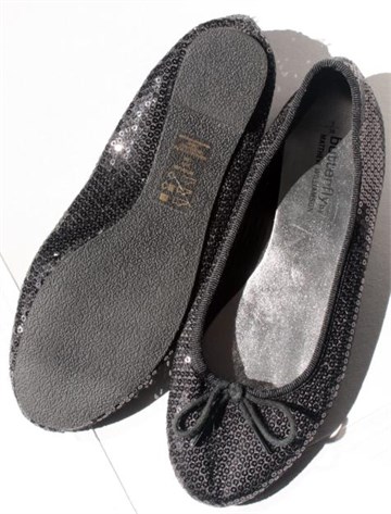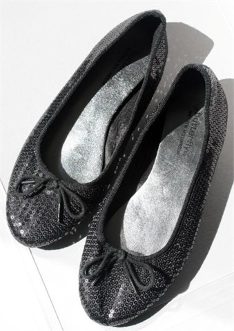 Preslatke balerinke crne boje, cijele sa našivenim šljokicama, mašnica na prednjoj strani. Gumeni džonovi, unutrašnjost srebrne boje.