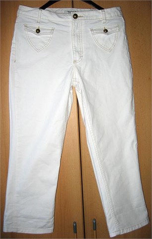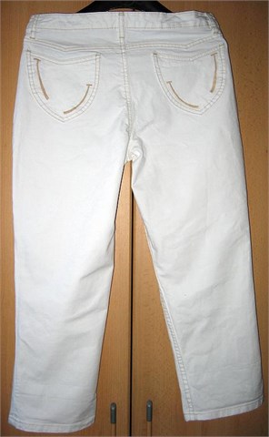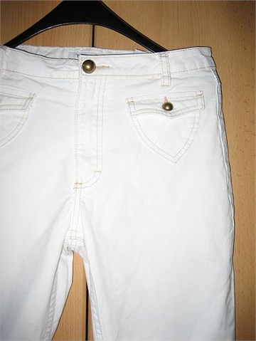 Poluduge hlače od bijelog trapera. Prednji džepići na preklop, stražnji klasični džepovi. Ukrasni zlatni gumbi, prošivi od zlatnog konca. Prednji cif i kopčanje, pasica za remen.