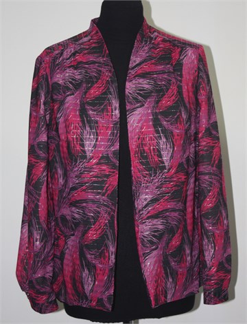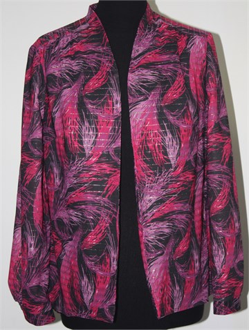 C&A tanji i lagan blazer crne boje sa šarenim printom i šljokavim prugama. Bez kopčanja, djelomično podstavljen (rukavi nisu pa su blago prozirni).