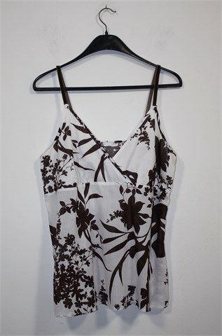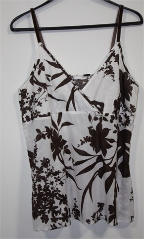 C&A topić/bluza (materijal je kao za tanje košulje) bijele boje sa tamno smeđim cvjetnim printom (kao na slici). Materijal ima diskretne prugice, naramenice su tanke i podesive (plišane, mjestimično se pliš malo skinuo ali nije jako primjetno). Podstavljena u dijelu prsiju, ostatak blago providan. Bočni cif, mali bočni prorezi. Stražnji gornji šav na leđima ima provedenu gumicu pa je blago rastezljiv. Tanji i lagan pamuk.