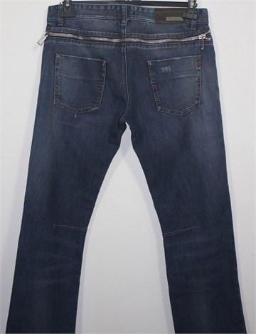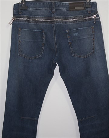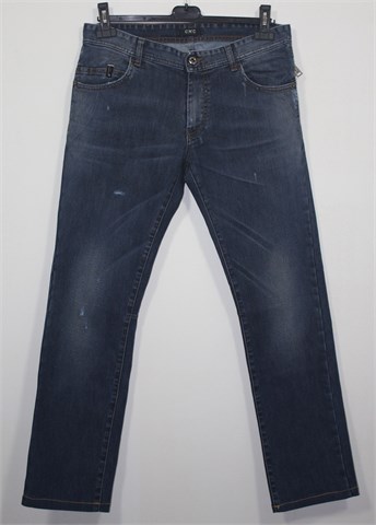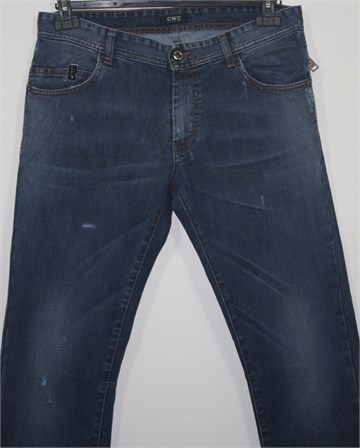 C'N'C traper hlače, srednje plave boje. Mjestimično poderanog i ispranog izgleda (tvornički). Prednji cif i kopčanje, pasica za remen. Prednji i stražnji džepovi. Blago rastezljive.