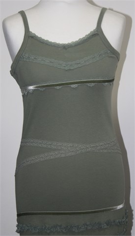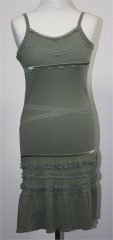 CFL (colors for life) pamučna haljina maslinasto zelene boje. Tanke naramenice, ukrasni prošivi sa čipkom i trakicama od pliša. Deblji i rastezljiv pamuk.