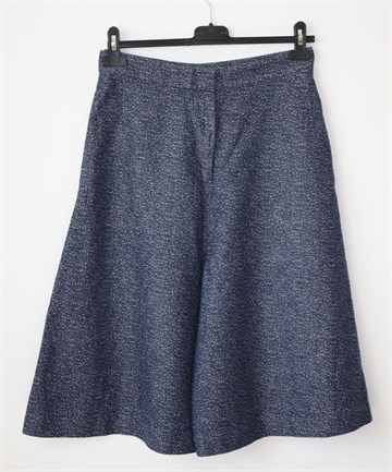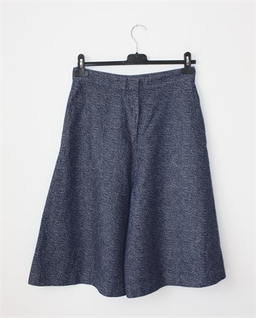 COS hlače sa širokim nogavicama plave boje sa bijelim sitnim uzorkom na materijalu (vidljivo na slikama). Prednji cif i kopčanje, prednji bočni džepovi. Čvrst i nerastezljiv materijal. Baggy model (vidjeti mjere).