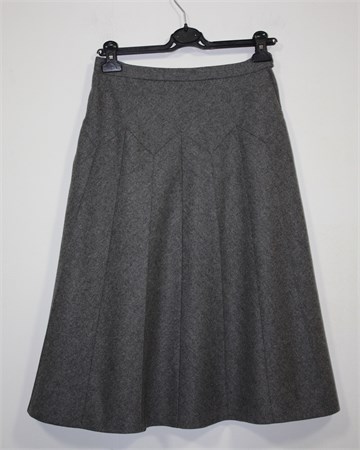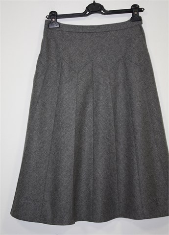 Cacharel dizajnerska vunena suknja prošarano sive boje. Ukrasni prošivi sa prednje i stražnje strane. Bočni cif i gumbić, podstavljena. Deblji i topli materijal.