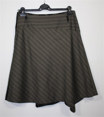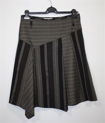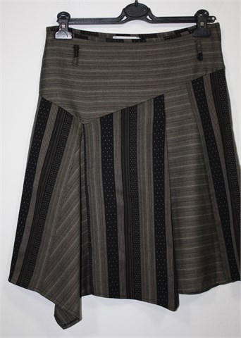 Cache Cache suknja od tanjeg štofastog materijala, prošarano smeđe boje sa prugastim uzorkom. Tanke ušice za remen, bočni cif. Sa prednje strane faldice i asimetrični rubovi.