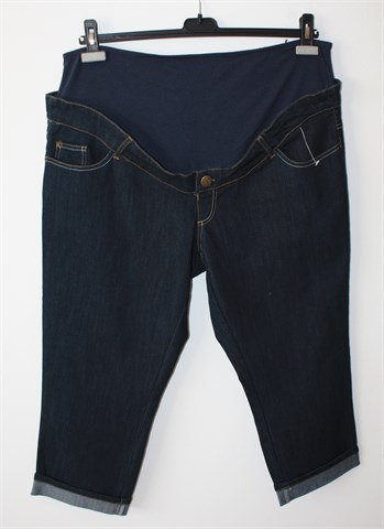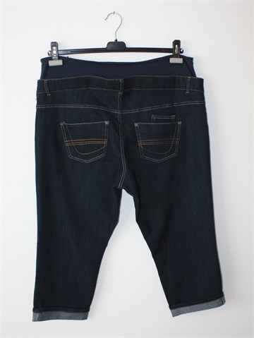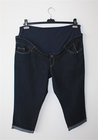 Calin Kalin (Kiabi) poluduge traper hlače za trudnice, tamno plave boje. Prednji i stražnji klasični džepovi, prednji ukrasni gumb. Tamno plava guma u struku, rastezljive. Na prednjoj lijevoj nogavici sitno oštećenje u tkanju. Bočna regulacija širine struka (rastezljive trake i gumb sa svake strane).