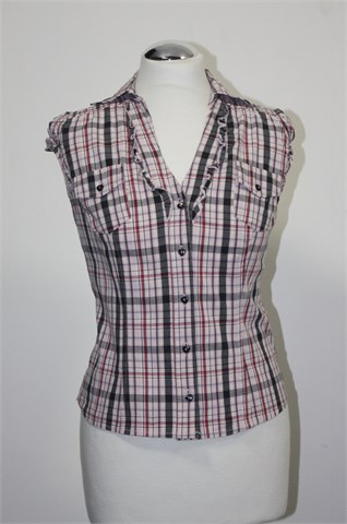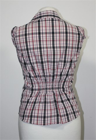 Calliope košulja sa kratkim rukavićima, karirani uzorak u rozo-crno-bijeloj kombinaciji. Prednje kopčanje (svi gumbi su ukrasni - srčeka), bočni džepići sa preklopom i gumbom. Gumice na ramenima, krajevima rukava i sa stražnje strane. Strukirana, rastezljiva.