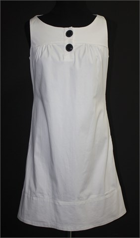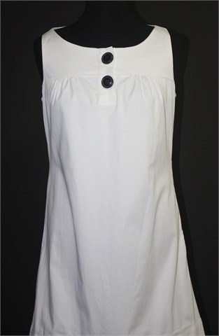 Camaieu haljina bez rukava, bijele boje. Prednje kopčanje sa dva crna gumba, bočni cif. Blago rastezljiv materijal, deblji pamuk.