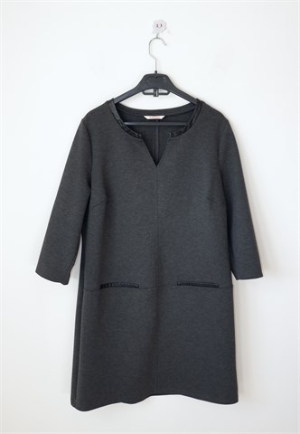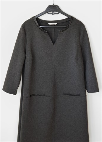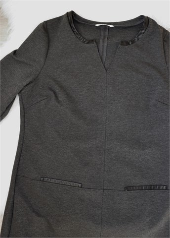 Camaieu haljina/tunika sa poludugim rukavima, tamno prošarano sive boje. Obrub ovratnika i imitacija džepova sa prednje strane ukrašeni našivenim trakama od umjetne kože/skaja. Materijal srednje debljine, rastezljiv (ima nešto sitnih mucica na materijalu).